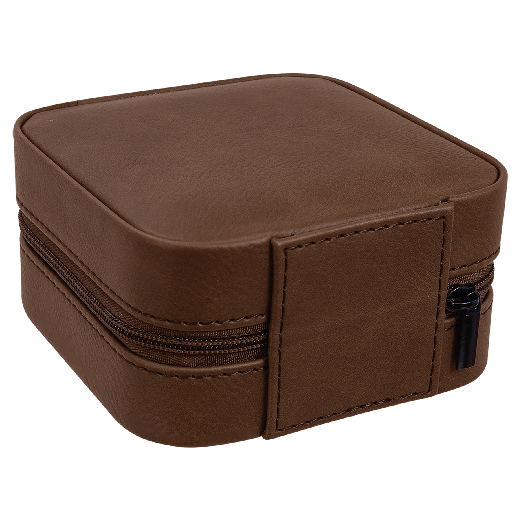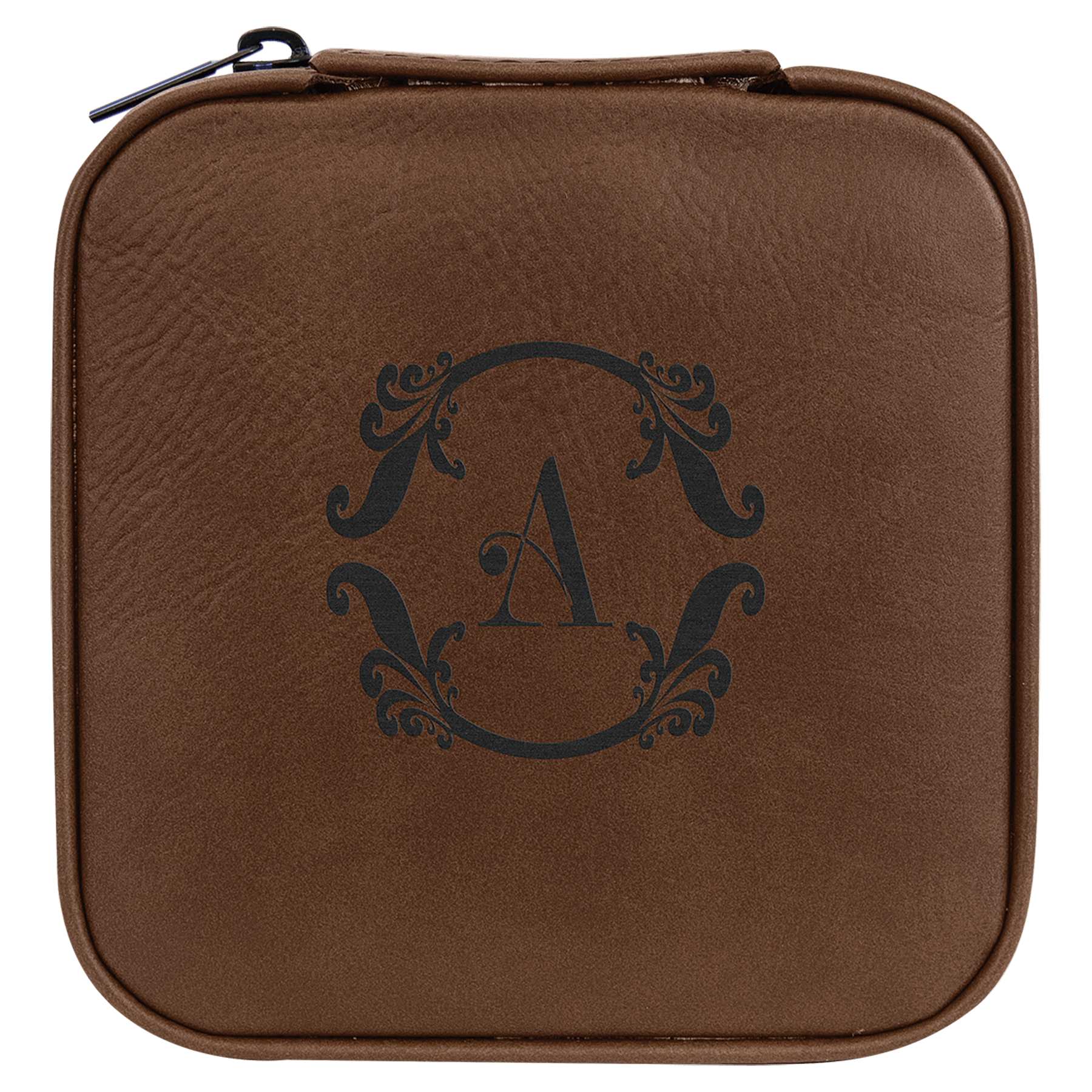 This compact travel jewelry box is made of faux leather, making it perfect for your suitcase or bag. With secure compartments for storing chains, rings, and earrings, it is available in both tan and black lining. Personalize the front, back, or both to create a unique and thoughtful custom gift.